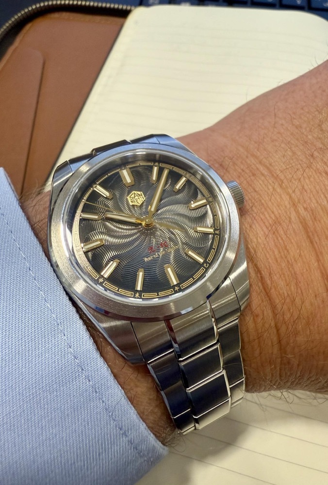 Guilloche Dial, Gilt Applied Hexagonal Logo & Applied Indice